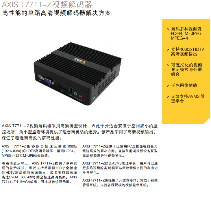AXIS T7711-Z視頻解碼器 高性能的單路高清視頻解碼器解決方案 AXIS T7711-Z視頻解碼器采用高緊湊型設計,因此十分適合安裝于空間狹小的監 控場所,為小型監看環境提供了理想而靈活的選擇。該產品采用了高清視頻輸出, 保證了穩定而高效的解碼性能。 AXIS T7711-Z 能 夠 以 全 幀 速 及 高 達 1080p (1920x1080) 的HDTV高清分辨率,解碼H.264, MPEG-4以及M-JPEG視頻流。 在高清顯示屏上,AXIS T7711-Z提供了多種靈 活的顯示模式,可以支持單畫面1080p全幀速 的HDTV高清視頻畫面輸出,或者支持四畫面 高達SVGA (800x600) 的全幀速高清畫面。AXIS T7711-Z支持VGA輸出,可連接傳統顯示屏。 AXIS T7711-Z提供了比使用PC連接顯視器更為 經濟高效的解決方案,直接從前端視頻設備獲取 高清視頻流進行視頻顯示。 AXIS T7711-Z結合AVMS管理平臺,用戶可以進 行多路視頻的實 時畫面與回放錄像之間的自由切 換與顯示。 AXIS T7711-Z也提供了開放性接口,集成于視頻 管理系統,支持各種規模的視頻顯示系統。 數據表 > 解碼多種視頻流 H.264, M-JPEG, MPEG-4 > 支持1080p HDTV 高清視頻輸出 > 可定義化的視頻 顯示模式與分屏 組合 > 千兆網絡鏈路 > 無縫支持AVMS 管 理平臺 技術規格 - AXIS T7711-Z視頻解碼器 系統特性 視頻壓縮 H.264 (MPEG-4 Part 10/AVC) MPEG-4 Part 2 Motion JPEG 分辨率 單畫面顯示時,在最高1080p (1920x1080) 分辨率下可 達25fps全幀速 四畫面顯示時,在最高SVGA (800x600) 分辨率下可 達25fps全幀速 九畫面顯示時,在最高VGA (640x480) 分辨率下可 達15fps 圖像設置 支持多路輪巡顯示 支持自定義分屏顯示 AVMS軟件最高支持25分屏顯示(顯示分辨率的大小會 影響視頻幀速) 預設布局 支持自定義畫面布局及其保存和調用 錄像回放 支持相同性能的錄像回放 1路1080p (1920x1080) 或4路SVGA (800x600) 全幀速 回放 支持實時視頻與錄像回放同屏顯示技術 虛擬電視墻 支持AVMS平臺的虛擬電視墻管理功能 (AVMS專業版 與企業版支持) 多碼流控制 支持多碼流顯示技術,高低碼流自調整機制 視頻輸出 支持高清輸出 網絡 網絡接口 千兆網絡接口 網絡功能 支持單播,組播獲取視頻流,支持從攝像機或AVMS平臺 獲取視頻流 支持的協議 IPv4, HTTP, TCP,RTSP, UDP, DHCP 系統集成 應用程序編程 接口 支持AVMS軟件SDK開放包,支持第三方系統集成 用戶管理 用戶權限與密碼保護 事件觸發 攝像機事件觸發顯示,AVMS平臺報警接收與顯示,自定 義報警顯示機制 電子地圖 支持電子地圖顯示與管理,支持多層電子地圖 常規 電源 12V DC, 5A 尺寸 134毫米 * 134毫米 * 39毫米 重量 810克 工作條件 –20 °C 到 55 °C 濕度 5–95% RH (非冷凝) 操作系統 Windows 7 Embedded 視頻管理軟件 預裝AVMS解碼管理軟件 存儲器 32GB eMMC 存儲芯片 安裝方式 獨立安裝 壁掛安裝 接口 HDMI接口 VGA接口 12V DC 電源接口 RJ-45接口 視頻管理軟件 預裝AVMS解碼管理軟件 認證 CCC認證 所含附件 電源, 安裝套件, 安裝指南 質保 安訊士3 年保修和延期保修可供選擇.